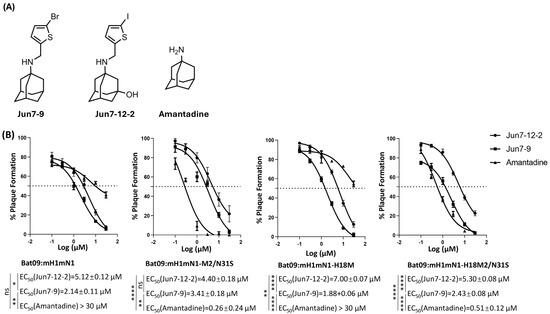 Amantadine was purchased from Sigma (St. Louis, MA, USA), and Jun7-12-2 and Jun7-9 were synthesized and prepared by Dr. Jun Wang’s lab [32,33]. Jun7-12-2 is an M2-S31N inhibitor, and Jun7-9 is a dual inhibitor of M2-WT and M2-S31N.