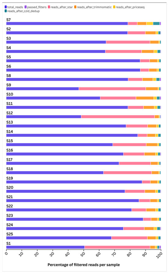 Chart showing percentage of reads passing filters for host cellular background per sample. The figure demonstrates significant proportions of reads that were filtered out using CZ-ID in silico filters. The chart was created with flourish.studio or equivalent available at https://flourish.studio (accessed on 25 December 2024).