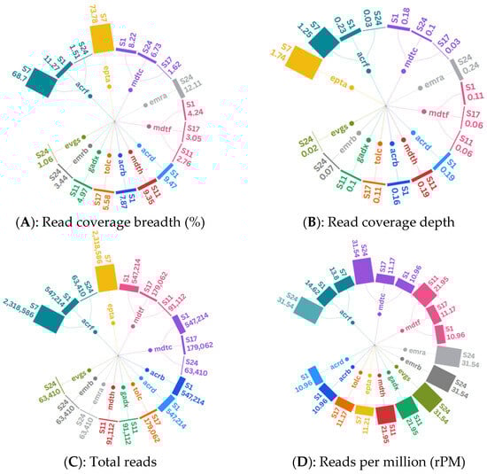 Radial tree charts portraying quality metrics of reads, of which 12 AMR genes were detected from five samples. Quality metrics are read coverage breadth, read coverage depth, total reads, and reads per million (rPM) described in panel (A–D), respectively. Inner circles represent detected AMR genes in relation to metric per sample. Outermost bars represent sizes of metric per AMR gene identified in each sample. Chart was created with flourish.studio or equivalent available at https://flourish.studio (accessed on 24 December 2024).