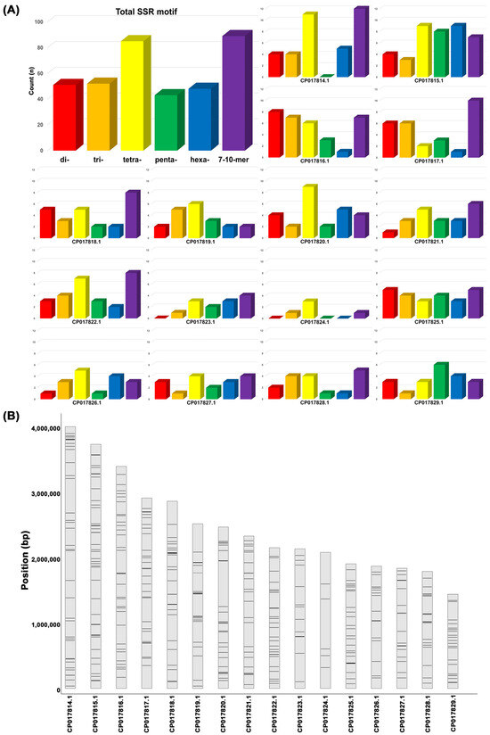 The genomic distribution and abundance of SSR motifs in Sclerotinia sclerotiorum. (A) The total counts of SSR motifs grouped by repeat unit length (2–10 bp), with tetranucleotide motifs showing the highest frequency. (B) The chromosomal locations of 368 polymorphic SSR variants mapped across the 16 scaffolds (CP017814.1—CP017829.1) of the reference genome (GenBank assembly accession: GCA_001857865.1). Regions of higher density indicate potential SSR clustering hotspots.