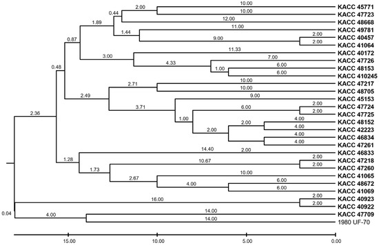 Genetic diversity among the 28 isolates was evaluated using the number of alleles (NA), expected heterozygosity (HE) [33], and polymorphism information content (PIC) [34] values. NA and HE were calculated using GenAlEx 6.51 b2 [35]. PIC values were estimated using Cervus v3.07 [36], following the classification of Botstein et al. [34], where PIC > 0.5 is considered highly informative, 0.25 < PIC ≤ 0.5 reasonably informative, and PIC < 0.25 slightly informative. Genetic relationships among the isolates were analyzed by computing the Euclidean distances based on SSR repeat number profiles. These distance values were used in order to construct an unweighted pair group method with an arithmetic mean (UPGMA) dendrogram using the genetic distance matrix generated using GenAlEx 6.51 b2. The resulting phylogenetic tree was visualized and edited using MEGA 12 [37].