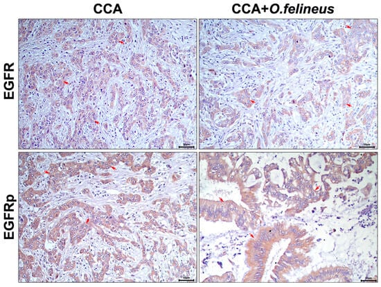 Immunohistochemistry of human liver samples (autopsy material) from patients with cholangiocarcinoma (CCA) and those with CCA associated with Opisthorchis felineus infection (CCA + OF); magnification ×400. EGFR: Epidermal growth factor receptor; EGFRp: Phosphorylated epidermal growth factor receptor; CCA: Cholangiocarcinoma; OF: Opisthorchis felineus. Specific signal areas are indicated by red arrows.