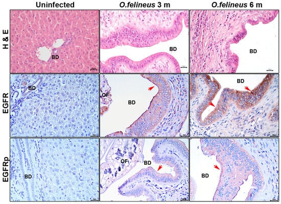 Histology and immunohistochemistry of the liver of M. auratus hamsters after 3 and 6 months of Opisthorchis felineus infection; magnification ×400. Scale: 20µm. H&E: Hematoxylin and eosin staining; BilIN: Biliary intraepithelial neoplasia; EGFR: Epidermal growth factor receptor; EGFRp: Phosphorylated epidermal growth factor receptor; BD: Bile duct; OF: Opisthorchis felineus. Specific signal areas are indicated by red arrows.