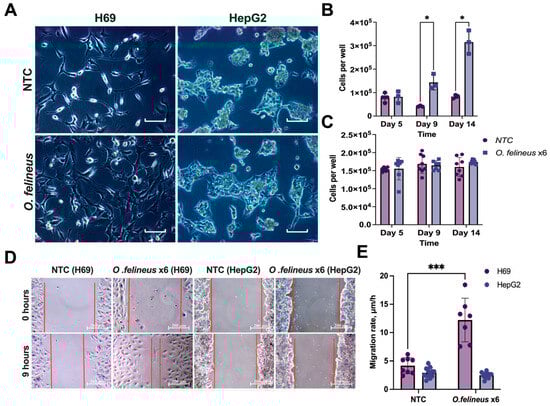 Proliferation and migration rates of H69 and HepG2 cells after co-cultivation with O. felineus: (A) Phenotypes of human cholangiocyte H69 cells and human hepatoma HepG2 cells at day 14; (B) Number of H69 cells after 5, 9, and 14 days of co-cultivation Scale: 100µm; (C) Number of HepG2 cells after 5, 9, and 14 days of co-cultivation with Opisthorchis felineus; (D) Wound healing assay. For clarity, the wound edge is marked with a red line; (E) Cell migration rate of H69 and HepG2 cells after 14 days of co-cultivation with adult worms. Data are presented as mean ± SD. NTCs—untreated H69/HepG2 cells; O.felineus x6—H69/HepG2 cells after co-cultivation with 6 helminths. Data represent the mean ± SD calculated for two visual fields per condition. * p < 0.05; *** p < 0.001 compared to untreated cells. Dunn’s post-hoc test.
