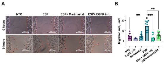 A similar inhibitory effect was observed during the assessment of the cell migration rates. The migration rate of H69 cells in the ESP and EGFR inhibitor group was decreased by 4.4 fold (p = 0.001), while Marimastat reduced it by 2.6 fold (p = 0.003), compared to cells treated with the ESP alone. Notably, the cell migration rates in the groups treated with either inhibitor did not increase and remained similar to that of the untreated control group (NTCs) (Figure 6A,B).