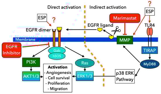 Scheme of EGFR/TLR4 signaling cascades likely involved in altering cholangiocyte proliferation and migration under the influence of the excretory–secretory product of O. felineus. Two main proposed pathways for EGFR activation are presented. The direct pathway of EGFR activation: O. felineus ESP potentially interacts with EGFR, causing activation of downstream PI3K/AKT and Ras/ERK1/3 signaling pathways followed by stimulation of angiogenesis, cell survival, cell proliferation, and migration. Alternatively, MMPs can be activated via TLR4-associated pathways, followed by the release of various EGFR ligands. These ligands then bind to EGFR. Marimastat inhibits MMP activity through direct binding, preventing the release of EGFR ligands. EGFR inhibitor can block EGFR activation, preventing its effects on cells. The scheme was prepared using GIMP 2.10 (https://www.gimp.org/) (accessed on 20 June 2025).
