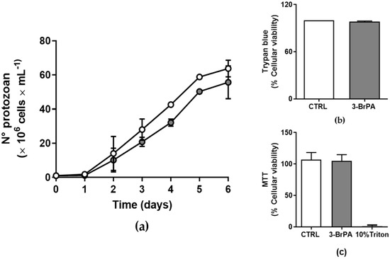 As previously demonstrated for amastigotes [22], epimastigote proliferation in vitro is not influenced by the addition of 300 µM 3-BrPA (Figure 1a), with no changes in cell viability, as measured by two different methodologies (Figure 1b,c).