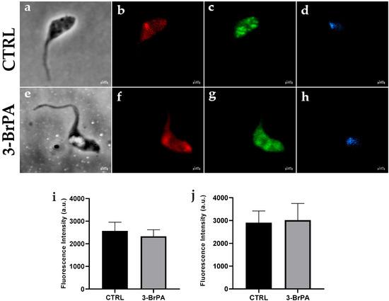 3-Bromopyruvate does not change mitochondrial potential or glycosomes. Immunofluorescence microscopy of T. cruzi epimastigotes grown in LIT medium with or without 300 µM 3-BrPA. Phase contrast (a,e). Mitochondrial membrane potential staining with MitoTracker ((b,f), red). Glycosome staining with anti-aldolase ((c,g), green). Nuclei staining with DAPI ((d,h), blue). Percentage of parasites with staining for Mitotracker (i) and aldolase antibody (j) in 90 parasites. Magnification 100×. Calibration bar 1 µm. Statistical analysis was performed with an unpaired Student t-test.