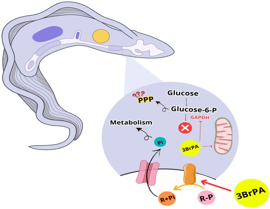 In summary, it was observed that 3-BrPA inhibits mitochondrial function and GAPDH activity. Investigating mitochondrial disruption by 3-BrPA is highly relevant due to the metabolic plasticity of T. cruzi. However, cells grown in the presence of 3-BrPA have compensation in fermentation or other pathways, such as the pentose phosphate pathway (PPP), to sustain the energy required for normal epimastigote proliferation. Therefore, studies of 3-BrPA may lead to the elucidation of potential therapeutic applications, as it has an urgent need to seek new therapeutic targets for Chagas disease (Figure 6). These results imply the need to develop a combination therapy when treating Chagas disease, as T. cruzi can modulate its metabolism in response to therapeutic pressure, distinguishing it from other protozoan parasites. This adaptive metabolic behavior suggests that monotherapy targeting a single metabolic pathway may not be sufficient to eradicate the parasite. In this way, developing more effective and less toxic approaches that consider different disease mechanisms is important.