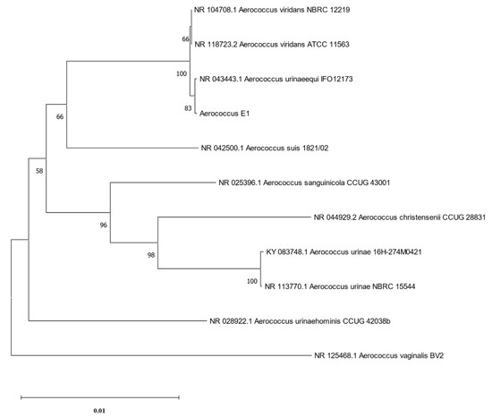 The phylogenetic tree was constructed using the software MEGA11 (version 11.0.13) [32], based on the 16S rRNA of strain E1 and 10 strains of Aerococcus, including A. viridans, A. urinaeequi, A. suis, A. sanguinicola, A. christensenii, A. urinae, A. urinaehominis and A. vaginalis, and it is shown in Figure 2. The results indicated that strain E1 belonged to the same cluster as A. viridans and A. urinaeequi, and that the similarity of the 16S rRNA of strain E1 to that of strains NBRC 12219 and ATCC 11563 of A. viridans and strain IFO12173 of A. urinaeequi was 99.65%, 99.24%, and 99.86%, respectively. In view of the sequence similarity of 16S rRNA being above 99% between strain E1 and both A. urinaeequi and A. viridans, strain E1 could only be identified at the genus level as Aerococcus.