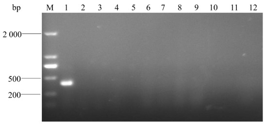 Electrophoresis detection for PCR products. M: molecular weight marker (2000 bp ladder); lanes 1–11: strains of A. urinaeequi E1, A. viridans ATCC 11563, A. viridans AHFY, Proteus mirabilis WHZ2, Pasteurella multocida HN-1, Clostridium perfringens CQ1, Enterococcus faecalis F1, Salmonella sms, Staphylococcus aureus ptqj, Bacillus subtilis KC1, and Escherichia coli 97, respectively; and lane 12: negative control.