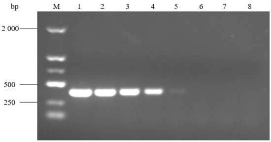 Sensitivity of the PCR detection assay. M: molecular weight marker (2000 bp ladder); lanes 1–7: different dilutions of 10−1, 10−2, 10−3, 10−4, 10−5, 10−6, and 10−7, respectively; and lane 8: negative control.