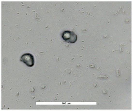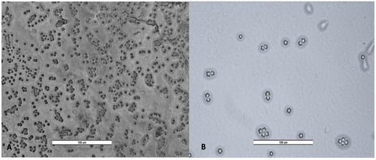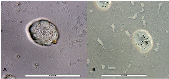 Figure 6. Cyst of Vermamoeba vermiformis (A) and trophozoites and cyst of Acanthamoeba spp. (B). Image was obtained with a LEICA DM500 microscope (20×). Scale bar represents 100 μM.