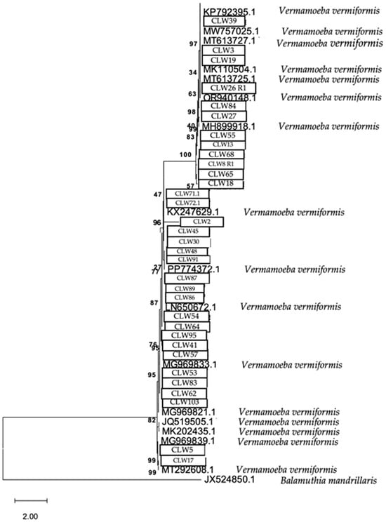 Figure 9. Phylogenetic connections among the species Vermamoeba vermiformis obtained from water samples in this study. The isolates obtained in this study are marked within boxes. Other species sequences were obtained from GenBank and their accession numbers are shown. The tree is computed using the Maximum Likelihood method and measured in the number of substitutions per site. The tree is rooted with Balamuthia mandrillaris as the outgroup. The percentage of replicate trees, in which the associated taxa are clustered together in the bootstrap test, is shown next to the branches (in bold). Scale bar = 2.00 substitutions/site.