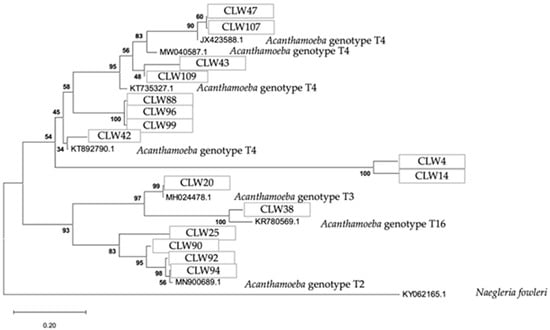 27. Schroeder, J.M.; Booton, G.C.; Hay, J. Use of subgenic 18S ribosomal DNA PCR and sequencing for genus and genotype identification of Acanthamoebae from humans with keratitis and from sewage sludge. J. Clin. Microbiol. 2001, 39, 1903–1911. [Google Scholar] [CrossRef]
