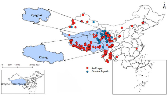 Distribution records of Radix spp. and Fasciola hepatica on the Qinghai-Tibetan Plateau and neighboring areas.