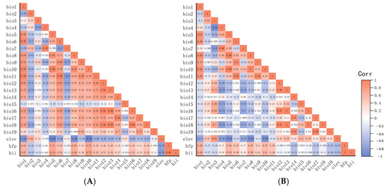 In ArcGIS 10.8, a suite of environmental factors, namely Bio1–19, Elev, Hii, and Hfp underwent initial processing. Correlation analysis results are shown in Figure 3A,B.