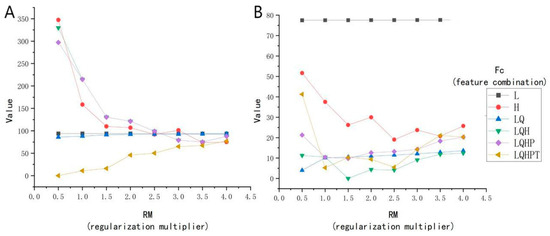 Correlation analyses of environmental factors. (A) The Radix spp. model of ENMeval packet is used to optimize the results. (B) The Fasciola hepatica model of ENMeval packet is used to optimize the results. Note: L represents linear; Q represents quadratic; H represents hinge; P represents product; and T represents threshold.