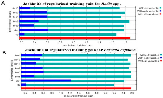 Jackknife test results of the environmental factors affecting the distribution of Radix spp. and Fasciola hepatica. (A) Jackknife test results of the environmental factors affecting the distribution of Radix spp. (B) Jackknife test results of the environmental factors affecting the distribution of Fasciola hepatica.