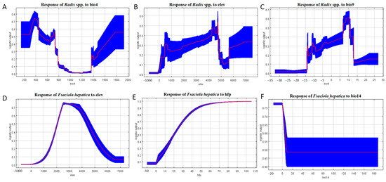 Response curves of the main environmental factors affecting the distribution of Radix spp. and Fasciola hepatica. (A) Response of Radix spp. to Bio 4. (B) Response of Radix spp. to elevation. (C) Response of Radix spp. to Bio 9. (D) Response of Fasciola hepatica to elevation. (E) Response of Fasciola hepatica to human footprint index. (F) Response of Fasciola hepatica to Bio 14. Note: bio4 represents temperature Seasonality, elev represents elevation, bio9 represents mean temperature of the driest quarter, hfp represents human footprint index, and bio 14 represents precipitation of the driest month. The red line in the figure represents the average value, and the blue block shows the range of this value in the results of ten simulations.