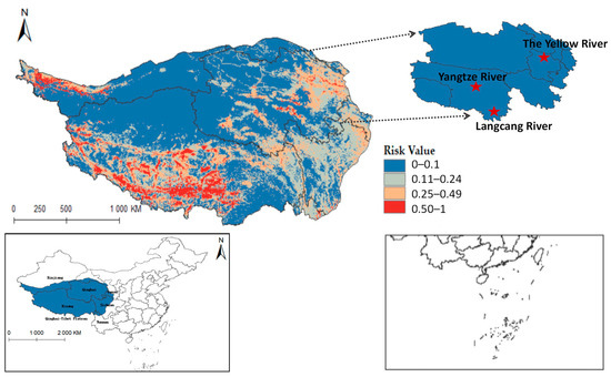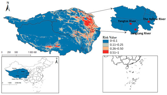 Furthermore, integrating the Qinghai-Tibet Plateau river system on the distribution map reveals that Radix spp. suitable habitats mainly cluster near riverine systems (see Figure A1). These habitats exhibit high adaptability in the upper reaches of the Yellow River, Yangtze River, and Lancang River in Qinghai Province. Using ArcGis 10.8 to quantify each suitable area, the Qinghai-Tibet Plateau has the following characteristics: high-risk area encompasses 14.1602 × 104 km2, the medium-risk area covers 33.5264 × 104 km2, the low-risk area extends over 58.0277 × 104 km2, and the non-risk area spans 146.3503 × 104 km2. These data suggest an elevated transmission risk of Radix spp. in the Tibet region.