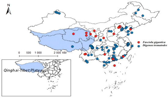 As carriers of fascioliasis and clonorchiasis, Fasciola gigantica and other digenean parasites use Lymnaeidae as key intermediate hosts. Through meticulous data sorting, we have acquired the nationwide distribution data for 44 records on fascioliasis caused by F. gigantica (see Supplementary Table S3) and 114 records on infections by several species of Digenea trematodes (see Supplementary Table S4). As depicted in Figure 12, these parasites are mainly distributed in southern and central China, with sporadic records in the Qinghai-Tibet Plateau and adjacent regions. Due to limited local distribution data, this study does not model the plateau, indicating fascioliasis as the predominant trematode disease there. Previous studies reported intermediate-shaped trematodes in Yunnan and Guangxi [40,41] and Qinghai’s Yushu area [42]. However, incomplete research on Qinghai’s intermediate-shaped trematodes mean that the potential impacts cannot be ruled out, limiting this study’s scope.