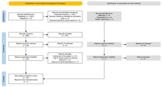 A total set of 2341 identified publications was pooled in EndNote 21, where duplicate removal reduced the set to 840 unique records. Subsequently, an initial screening of the articles was conducted based on the relevance of their titles and abstracts, resulting in the exclusion of 741 articles. Additionally, four articles were excluded based on full-text unavailability. Finally, a full-text reading of the remaining 95 articles resulted in the inclusion of 43 articles after 52 publications were excluded based on the following criteria: (1) contextual irrelevance to the subject of this review (absence of CRISPR application, absence of application to human herpesviruses, or absence of therapeutical strategy), (2) type of article (review or meeting abstract), and (3) absence of result descriptions. Figure 1 displays the PRISMA flow diagram, generated with the PRISMA Flow Diagram tool [36], which provides a schematic visualization of the article selection process.