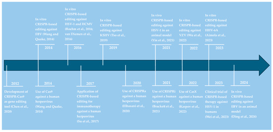 Timeline visualizing the application of CRISPR technologies against herpesvirus infections. References in alphabetical order: Aimola et al., 2023 [37]; Brackett et al., 2021 [38]; Chen et al., 2020 [30]; Ding et al., 2024 [39]; Elbasani et al., 2020 [40]; Karpov et al., 2022 [41]; Roehm et al., 2016 [42]; Su et al., 2017 [43]; Tso et al., 2019 [44]; van Diemen et al., 2016 [45]; Wang and Quake, 2014 [46]; Wei et al., 2023 [47]; Wu et al., 2022 [48]; Yin et al., 2021 [49].