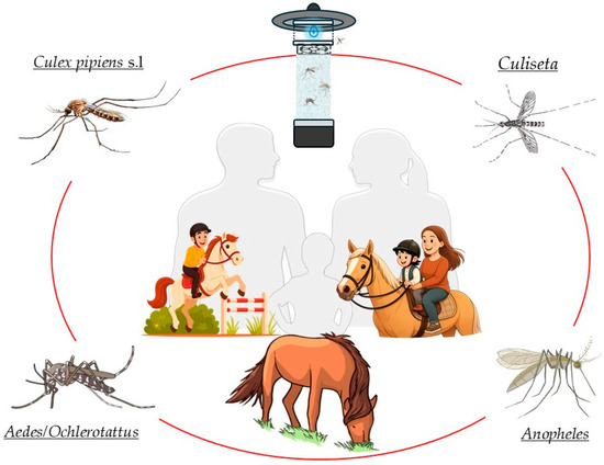Diptera-borne pathogens and the diseases they cause are emerging and re-emerging in Europe, mainly due to climate change, globalization, and environmental changes, natural or artificial, and many of them are zoonotic in nature with a great impact on public health [4,9]. At the same time, these diseases are mostly influenced by climate change since these vectors are highly dependent on the ecology of the environment, and so the weather conditions will determine the presence and distribution of mosquitoes [34]. The presence of vector-borne diseases will always depend on the coexistence of suitable hosts, vectors, and pathogens [35]. As with other entertainment facilities, equine centers provide considerable benefits for people to enjoy nature, relaxation, or walks. These facilities can also ensure the conditions to enhance the presence of different genera of culicids with great vectorial capacity, as demonstrated in more than half of the equine centers in the present investigation. In addition to this, it looks very conceivable that the constant presence of animals (horses) and humans (horse riders in some cases) provides an ideal environment for maintaining the cycle of different species of hematophagous dipterans as they can serve as potential hosts for the blood meal intake [24,36]. The several species found in this study agree with previous findings in the same area [13,14,27,37].