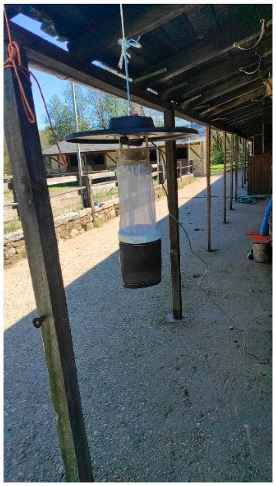A total of 77 samplings were conducted, involving 63 with CDC-UV (ultraviolet) traps, two oviposition traps, and 12 dipping. One miniature downdraft blacklight (UV) trap Model 512 (Entomopraxis®, Barcelona, Spain) (Figure 3), which allows for the capture of adult dipterans, was placed in each center close to the animals at 1.7 m above ground and left running continuously from dusk until the following morning (12 h approximately).