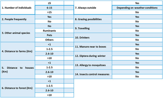 A brief questionnaire was distributed among the owners of the equestrian centers to obtain information on the main points related to the possible presence of dipterans regarding the characteristics of each equine facility, horse management, or insect control measures. Fourteen questions were asked and several answers were possible: number of animals housed, frequency of people present in the facilities, other animal species nearby, distance (km) to farms, houses and forest, stabling regime, grazing possibilities, traveling animals, presence of drinkers in the boxes, presence of manure near to boxes, presence of Diptera during winter, horse allergies to mosquitoes, and insect control measures (Figure 5).