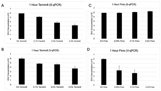 After 1 h of treatment with Termin-8, there was a reduction in viral DNA (S-qPCR) equivalent to that observed in the V-qPCR assay, with the greatest reduction in viral DNA occurring at the highest concentration (0.3%, Figure 1A,B). While Finio showed negligible viral DNA reduction after an hour of treatment regardless of dose, as observed by S-qPCR, when Finio was added at the highest concentration (0.2%), there was complete inactivation (>5 log reduction units) of viable virus (Figure 1C,D).