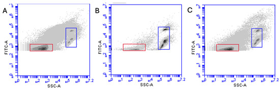 Flow cytometry plots of non-treated (A) and highest concentration of Finio (B) and Termin-8 (C), with red rectangles representing EhV population while blue rectangles represent control staining beads.