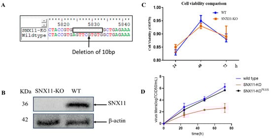 In our preliminary investigations, HeLa cells were initially employed for CRISPR screening and validation procedures owing to their experimental robustness and operational convenience [15]. Although 293T cells demonstrated reduced compatibility with CRISPR screening platforms compared to HeLa cells, their superior susceptibility to Dabie bandavirus infection coupled with enhanced transfection efficiency made them more appropriate for subsequent functional characterization. Based on these considerations, we generated SNX11-knockout 293T cell lines using the CRISPR/Cas9 system in the current study. The efficiency of protein depletion was confirmed by Western blotting (Figure 1A,B).