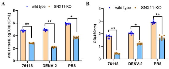 To determine whether the inhibitory effect of SNX11 deficiency extends beyond Dabie bandavirus, SNX11-knockout (SNX11-KO) and wild-type (WT) 293T cells were infected with dengue virus serotype 2 (DENV-2). Viral infection was assessed at 48 h post-infection (hpi) by measuring the levels of DENV-2 NS1 antigen released into the culture supernatant using a commercial ELISA kit (MEIMIAN, Taizhou, China). Additionally, infection with the Hantaan virus strain 76-118 (HTNV-76-118) and influenza A/Puerto Rico/8/1934 (H1N1; PR8) was assessed using the newly constructed SNX11-KO A549 cell line alongside their corresponding WT A549 controls. Similarly, at 48 hpi, viral infection for both HTNV-76-118 and PR8 was quantified by ELISA, targeting the viral nucleoprotein (N protein) present in the infected cell supernatants.