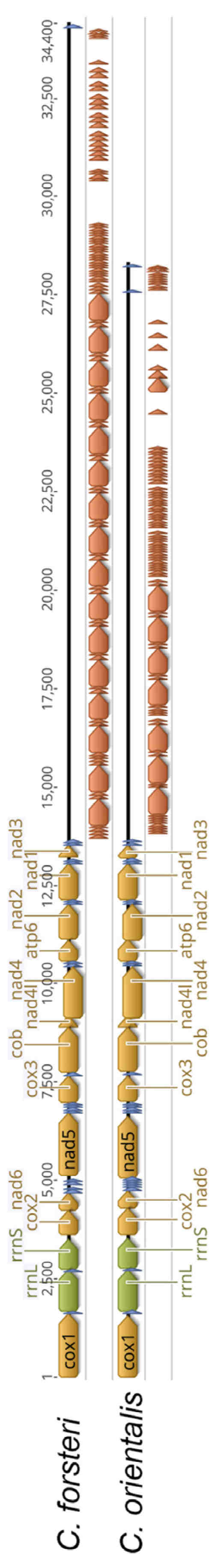 Linear view of the complete mitochondrial genomes of C. forsteri and C. orientalis. Block arrows indicate genes according to colour: yellow—protein coding, green—rRNA, blue—tRNA, orange—tandem repeats. Whole genome length of C. forsteri: 34,398 bp; and C. orientalis: 28,297 bp. Tandem repeat region length of C. forsteri: 20,510 bp; and C. orientalis: 14,397 bp.