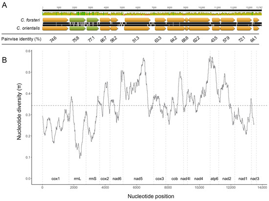 The final sequencing run for C. orientalis yielded a total of 5,750,829 reads, with a N50 of 4733 bp. The circular mitochondrial genomes for C. forsteri and C. orientalis were 34,397 bp and 28,297 bp in size, respectively, with coding regions of 13,890 bp and 13,900 bp, and a single non-coding region measuring 20,510 bp in C. forsteri and 14,397 bp in C. orientalis (Figure 1). A total of 36 genes were found for each species (Table 1 and Table S1), including 12 protein coding genes, 22 transfer RNA and 2 ribosomal RNA. The gene order was the same for both species, with all genes transcribed in the same direction. All genes used ATG or GTG start codons, and most genes used TAA or TAG stop codons, as common for trematodes [40,41]. For cox1 and nad4L in both species, and cox2, nad5, and atp6 in C. orientalis, abbreviated stop codons are present, with a single T nucleotide following the last complete codon of each gene. The nucleotide length of each coding gene was similar between the two species, with none having a difference in length greater than 42 bp. The largest difference was seen in nad2, which was longer in C. orientalis compared to C. forsteri. Three genes were identical in length across the two species: cox3, nad4, and nad1. The nucleotide content of both species was highest for T, with C as the least favoured nucleotide. However, C. forsteri had a higher relative G% content, while C. orientalis has a higher C% content (Table 2). The overall nucleotide diversity in the coding region was high between the two species (Figure 2). The genes with the highest diversity were cox2 (π = 0.38), nad5 (π = 0.43), nad2 (π = 0.36), atp6 (π = 0.50), and nad4 (π = 0.40). The lowest nucleotide diversity was seen in cox1 (π = 0.25), nad1 (π = 0.28), and nad3 (π = 0.29).