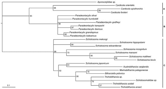 Partial cox1 phylogenetic tree of Cardicola forsteri and Cardicola orientalis with related trematode species. Grouping of closely related species represented by letters on right side of tree: (A) Cardicola spp., (B) Paradeontacylix spp., (C) Schistosomes, with Aporocotylidae sp. resolved to be the outgroup. Bootstrap support for each is not shown. The scale bar represents substitutions per site.