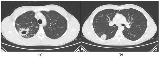 Chest CT scans (29 April 2024): (a) large cavitary lesion in the right upper lobe; (b) nodular lesion in the lower lung lobe and a discrete “tree-in-bud” pattern.