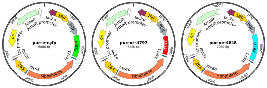 The pUC-OE plasmid backbone was linearized using restriction enzymes (FastDigest EcoRI/XhoI, Thermo Scientific, Waltham, MA, USA) (Figure 1). CFEM domains were PCR-amplified with primers (designed by Oligo 7/version 7.56) listed in Table 1 using Q5 High-Fidelity DNA Polymerase (NEB, M0491) under cycling conditions, 2× Taq PCR MasterMix Ⅱ 12 μL., up and down primers 1 μL (10 μM (Table 1)), 1 μL DNA, 10 μL ddH2O. Amplified fragments were purified (Monarch PCR Cleanup Kit, T1020) and cloned into linearized pUC-OE via Gibson Assembly® Master Mix (NEB, E2611). The recombinant plasmids were transformed into E. coli DH5α competent cells (Takara, 9057, Shizuoka, Fuji City, Japan) and plated on LB agar with ampicillin (100 μg/mL). Positive clones were verified by colony PCR and Sanger sequencing. Validated plasmids were extracted (GeneJET Plasmid Miniprep Kit, K0502), and overexpression cassettes were amplified using PrimeSTAR Max DNA Polymerase (Takara, R045A). Purified fragments (ethanol precipitation with 0.3 M sodium acetate) [20] were electroporated into M. bicuspidata competent cells (Bio-Rad Gene Pulser Xcell, 1.5 kV, 200 Ω, 25 μF), followed by recovery in YPD medium at 28 °C for 48 h.