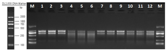 RNA electropherogram. Note: 1–3 M. bicuspidata control (sterile medium, M/CK), 4–6 hemocyte stress control (MB/T1), 7–9 Fe3+ ion control (1 mM FeCl3, MF/T2), and 10–12 co-stress group (MBF/T3).