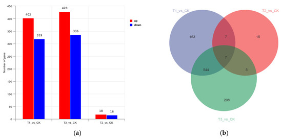 (a) Differential Gene Expression Volcano Plot; (b) Differential Gene Expression Venn Plot. Note: CK is the M. bicuspidata control, T1 is the hemocyte stress group, T2 is the Fe ion stress group, and T3 is the co-stress group.