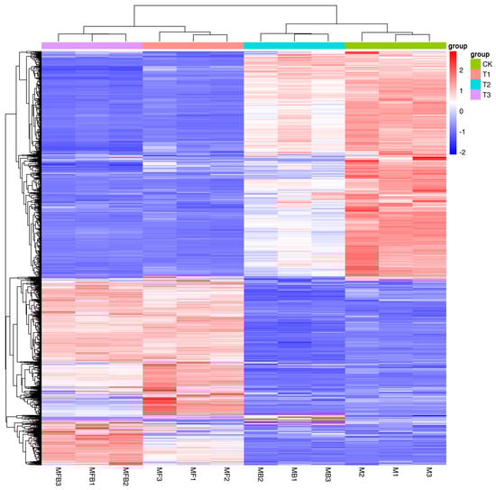 Heat map of gene expression. Note: M. bicuspidata control (sterile medium, M/CK), hemocyte stress control (MB/T1), Fe3+ ion control (1 mM FeCl3, MF/T2), and co-stress group (MBF/T3).