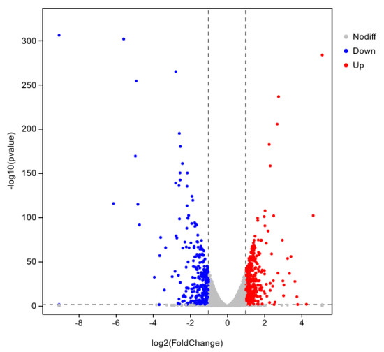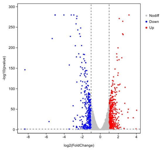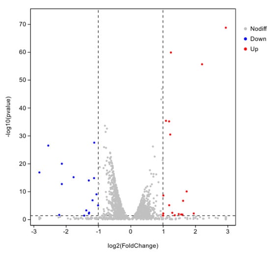 Using CK as the control group and T2 as the treatment group, a total of 34 DEGs were obtained with 18 genes up-regulated and 16 genes down-regulated using DESeq2 (v.0.5.0) software with |log2FC| ≥ 1.5 and p < 0.01 as the screening conditions (Figure 8).