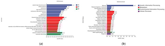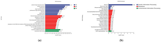 According to the KEGG database analysis, genetic information processing was significantly enriched for 4 pathways, ribosome (−log10P = 4.11) and ribosome biogenesis in eukaryotes (−log10P = 0.8), and metabolism was significantly enriched for up to 14 pathways, lipoic acid metabolism (−log10P = 1.3) and beta-alanine metabolism (−log10P = 1.3). Metabolism-enriched pathways were significantly enriched for up to 14 pathways, with lipoic acid metabolism (−log10P = 1.3) and beta-alanine metabolism (−log10P = 1.26) being the most significant; cellular processes (−log10P = 1.26) were significantly enriched in one pathway; and cellular processes (−log10P = 1.26) were significantly enriched in one pathway (−log10P = 1.26); cellular processes (−log10P = 1.26) were significantly enriched in one pathway, phagosome (−log10P = 1.26) environmental information processing 1MAPK pathway yeast (−log10P = 1.26) (Figure 11b).