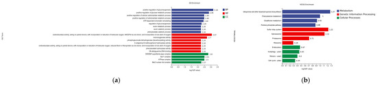 (a) GO classification of differentially expressed genes at 8 h of co-stress; CC is Cellular Component, BP is Biological Process, and MF is Molecular Function. (b) KEGG enrichment analysis of differentially expressed genes at 8 h of co-stress.
