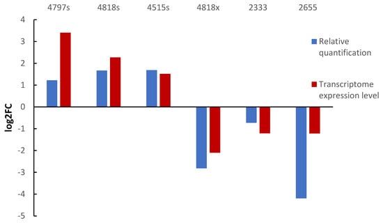 Three up-regulated and three down-regulated genes were selected for qPCR analysis to determine their relative expression. β-actin was used as the internal reference gene, and log2FC values were calculated. The log2FC values of each gene were consistent with the transcriptome expression data (Figure 12).