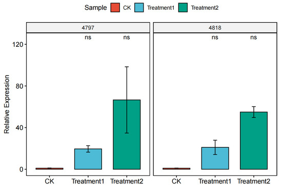 Relative expression of overexpression strains. Note; 4797: CK is the expression of the 4797 gene in M. bicuspidata, Treatment 1 is the expression of the 4797 gene in the 4818 gene overexpression strain, Treatment 2 is the expression of the 4797 gene in the 4818 gene overexpression strain; 4818: CK is the expression of the 4818 gene in M. bicuspidata, Treatment1 is the expression of the 4818 gene in the 4797 gene overexpression strain, Treatment 2 is the expression of the 4818 gene in the 4818 gene overexpression strain. “ns” means “not significant”.