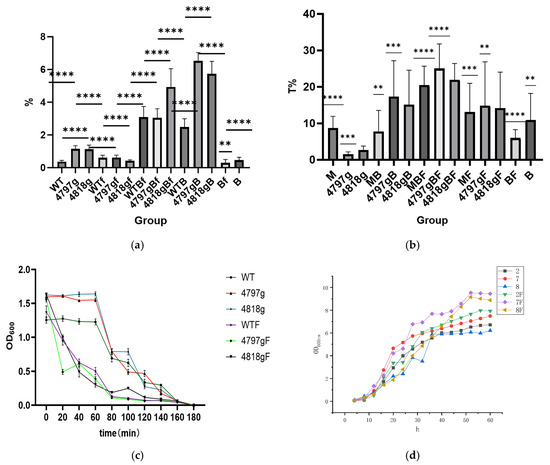 Basic functional analysis of overexpression strains. Note: (a) is the result of MTT staining, the M. bicuspidata group WT, the 4818 gene overexpression group 4818g, the 4797 gene overexpression group 4797g, the Fe ion group (WTF, 4818gF, 4797gF), the hemocyte group (WTB, 4818gB, 4797gB, B), and the co-stress group (WTBF, 4818gBF, 4797g, BF). (b) is the film-forming ability assay, the M. bicuspidata group M, the 4818 gene overexpression group 4818g, the 4797 gene overexpression group 4797g, the Fe ion group (MF, 4818gF, 4797gF), the hemocyte group (MB, 4818gB, 4797gB, B), and the co-stress group (MBF, 4818gBF, 4797g, BF). (c) is the flocculation ability assay, the M. bicuspidata group WT, the 4818 gene overexpression group 4818g, the 4797 gene overexpression group 4797g, the Fe ion group (WTF, 4818gF, 4797gF). (d) is the growth curve of the overexpression strains, the M. bicuspidata group 2, the 4818 gene overexpression group 8, the 4797 gene overexpression group 7, the Fe ion group (2F, 8F, 7F). “**” means p < 0.01, “***” means p < 0.001, “****” means p < 0.0001.