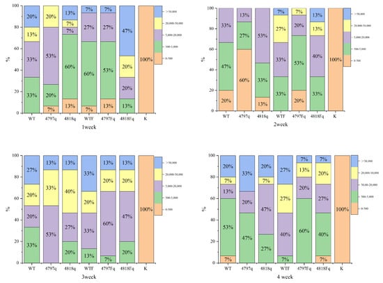 Percentage stacked bar chart for infection experiments with overexpression strains. Note: the M. bicuspidata group WT, the 4818 gene overexpression group 4818g, the 4797 gene overexpression group 4797g, the Fe ion group (WTF, 4818gF, 4797gF), the K is blank control; 0–500, 500–5000, 5000–20,000, 20,000–50,000, >50,000 are the range of colony counts.